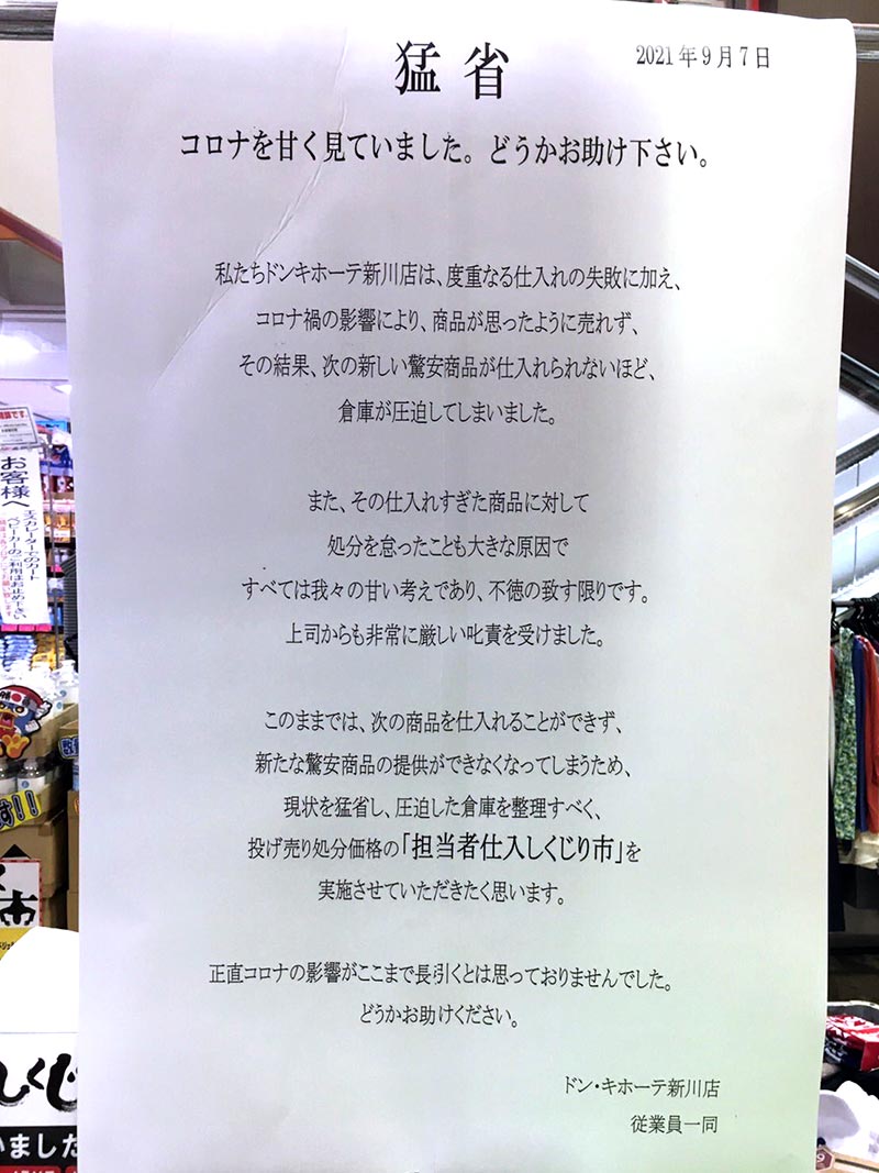 あと、わずかに考えられるのは、本当にこれだけの店舗で一斉に、仕入れミスとコロナ軽視が実際にあった、という可能性だけど、もしそうなら、ただの無能であって「物売るってレベルじゃねぇぞ!」になってしまうので、それだけはないと信じたい。