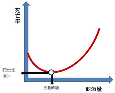 「全く飲まない」より「適量飲む」ほうが死亡率が低いことを裏付けてきた(はずの)「Jカーブ効果」。