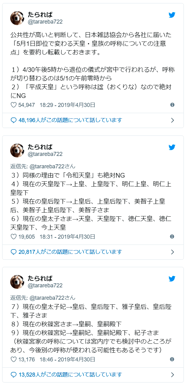 - 但し、これら「上皇」「上皇后」は今回限りのことで、次代には適用されないよ。