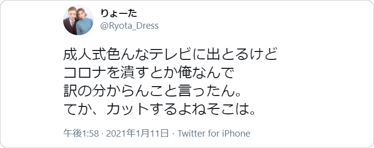 「コロナなんてぶっ潰してやるよ!」の人、少し後悔する 2021/1/14 オモロイ シェアしてね 今週読まれがちな記事 今週の読まれがちな記事 今週読まれがちな記事 小保方晴子さんの文春グラビア あの「岡田幻の銀侍」さんは名前に不満は無いが困ることもある 【スプーナリズム】「ゴツゴツのアハン!」からの言葉遊びシリーズ 上越教育大付属中学の土田菜里香さんが3億年に1人の陸上美少女だと話題 男女のオーガズムの違いをこんなふうに表現してみた、の図 江ノ電305F試運転に写り込んで撮り鉄に罵倒された外国人自転車ニキの顛末 “本家”の名前・ロゴをパクった風俗店がヒドいけど笑える 下線 あり余るパワーを他の人や物でなくコロナに向けてくれるのなら大歓迎だよ! とおっしゃるご同輩、こんにちは。館長です。 スポンサーリンク 北九州の成人式にて「コロナなんて俺がぶっ潰してやるよ」 その後ツイートで少し弱気に (りょーたさん「成人式色んなテレビに出とるけど…」 / Twitterより) ともあれ、新成人、おめでとう! スポンサーリンク