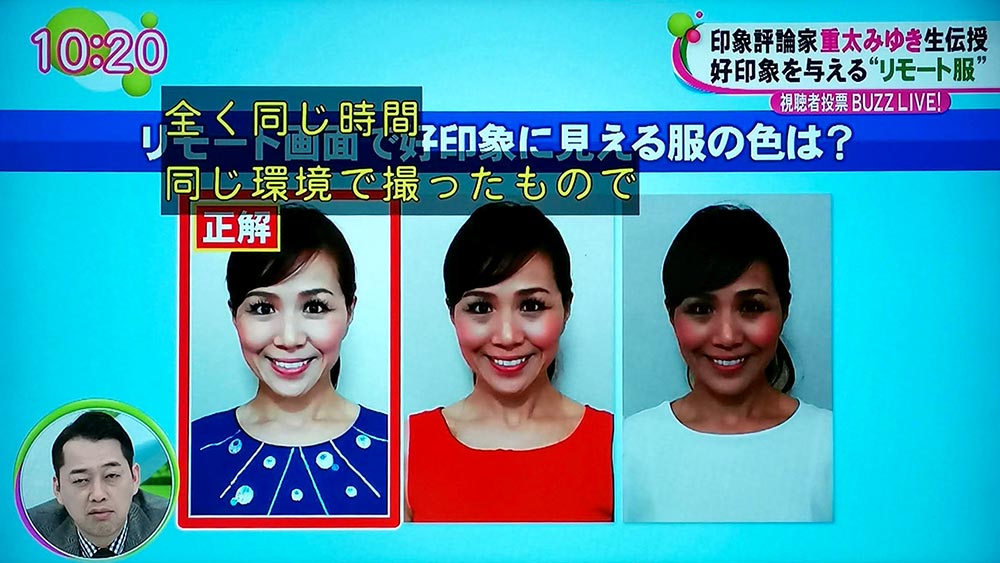 リモート画面で好印象を与える服の色は「青」「赤」「白」のうち、どれでしょう?