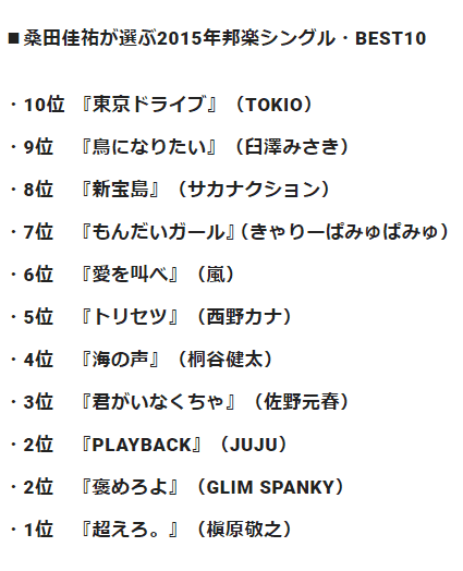 「桑田佳祐が選ぶ2015年邦楽シングルBEST20」の第10位にランクイン。